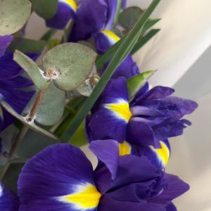 Букет из 15 ярких фиолетовых ирисов и эвкалипта в упаковке