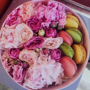 Корзина из ранункулюсов, пионовидных тюльпанов и маттиолы
