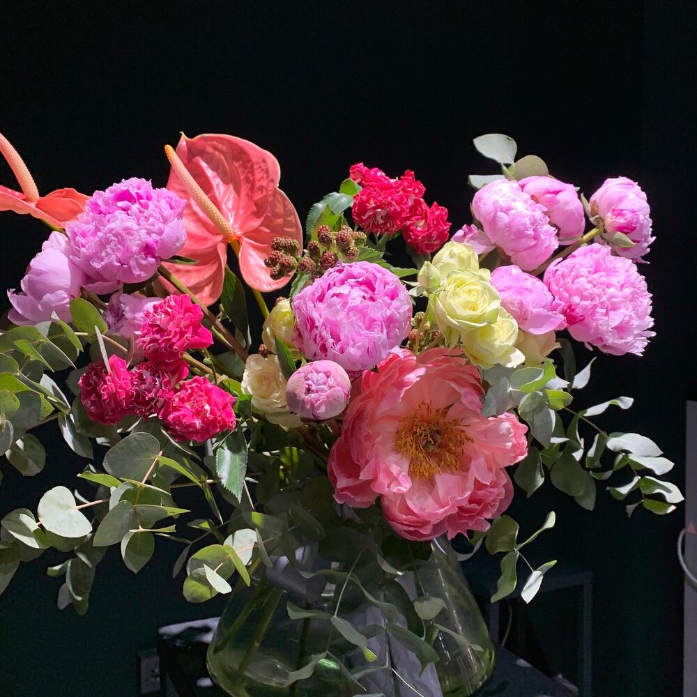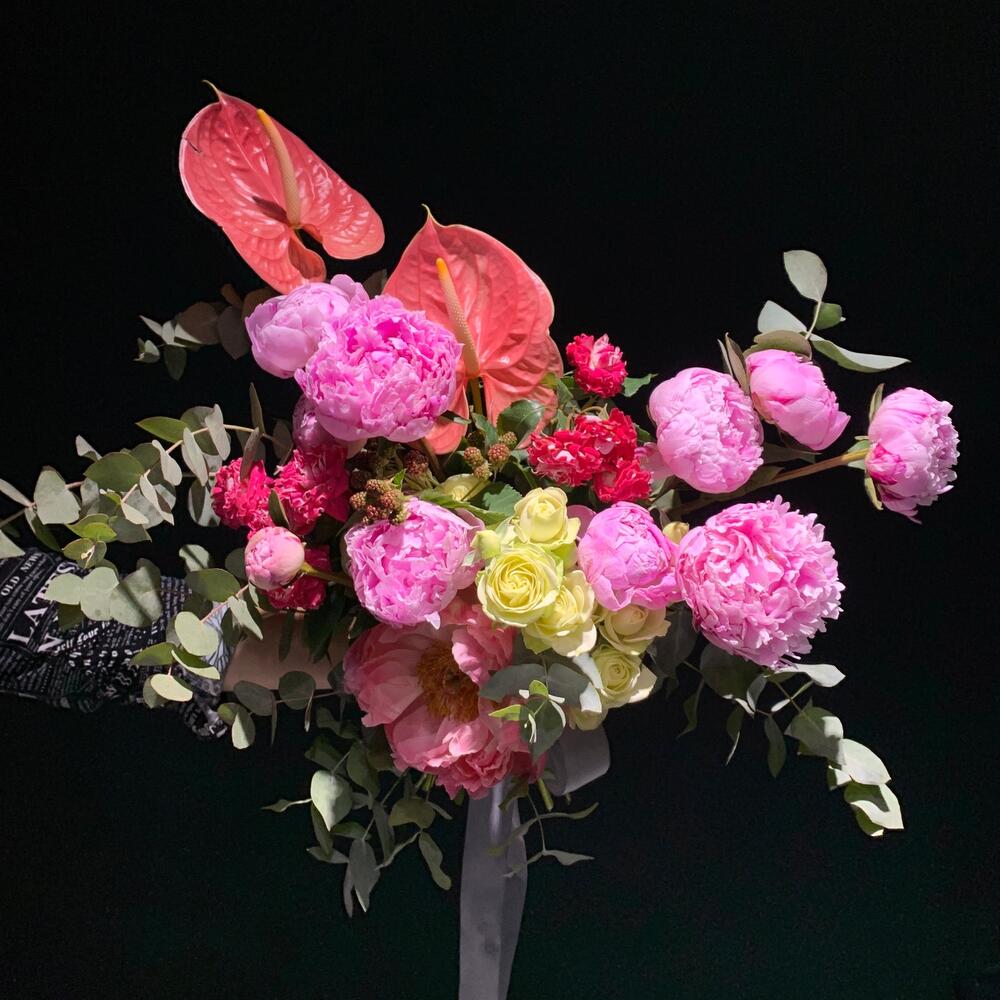Антуриум - 2 шт. Эвкалипт - 3 шт. Ветки малины - 2 шт. пионы - 11 шт. кустовые розы - 5 шт.